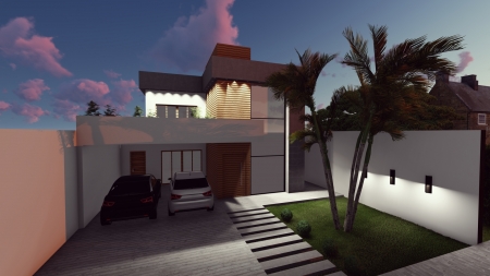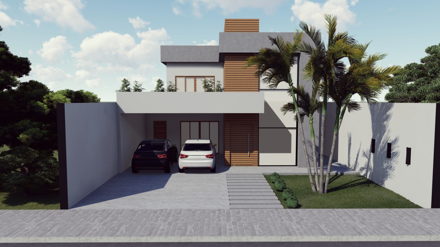 Projeto de um Sobrado com formas retas e marcantes. Une as texturas do concreto rígido com o aconchego da madeira